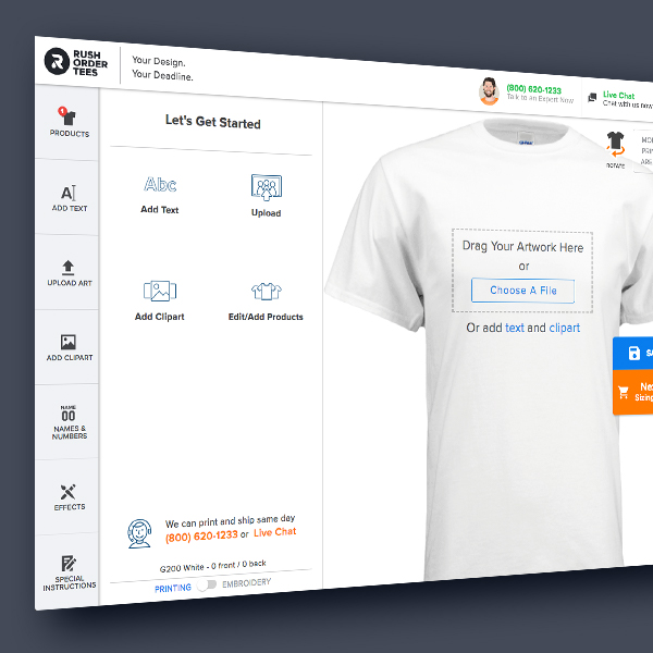 Our design studio is available 24/7 so you can design your custom tees anytime, anywhere. Add custom text, upload your own images, or add clip art from our catalog of 70,000 amazing and completely customizable design templates. You can also add a variety of effects, or do things like create custom team jerseys for your league by using our Names and Numbers feature. When you are done, you can easily customize your delivery date upon checkout to ensure a worry-free experience. With our guaranteed delivery dates (including email confirmation and shipping number), you can trust that your t-shirts will arrive on time, every time!